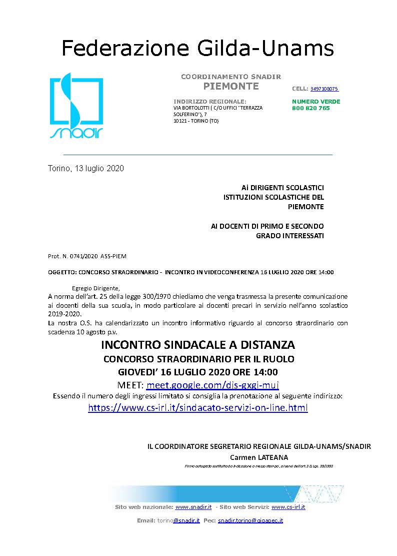 CONCORSO STRAORDINARIO - INCONTRO IN VIDEOCONFERENZA 16 LUGLIO 2020 ORE 14:00